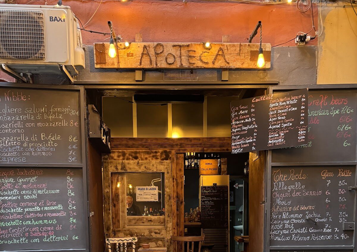 Apoteca Winebar, situata in Vico Berio 10 a Napoli, è un locale che propone un'accurata selezione di vini, sia locali che internazionali. L'ambiente si distingue per un design intimo e accogliente, con arredi che riflettono l'autenticità della tradizione partenopea. Inserita nel vivace contesto del centro storico di Napoli, Apoteca Winebar offre un’esperienza di degustazione che invita alla contemplazione e al relax, rendendola una tappa interessante per gli amanti del vino e della cultura gastronomica della città.