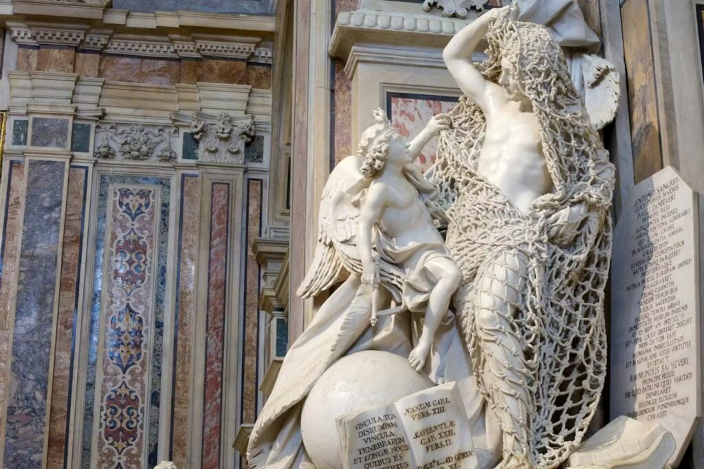 Accanto al Cristo Velato si trovano altre sculture di eccezionale valore, come la Pudicizia, opera di Antonio Corradini, simbolo di purezza e virtù, e il Disinganno, realizzato da Francesco Queirolo, che raffigura un uomo liberato dalle catene dell’ignoranza attraverso un virtuosismo tecnico senza pari. Ogni opera custodisce significati simbolici profondi e racconta la visione illuminata del Principe di Sansevero.