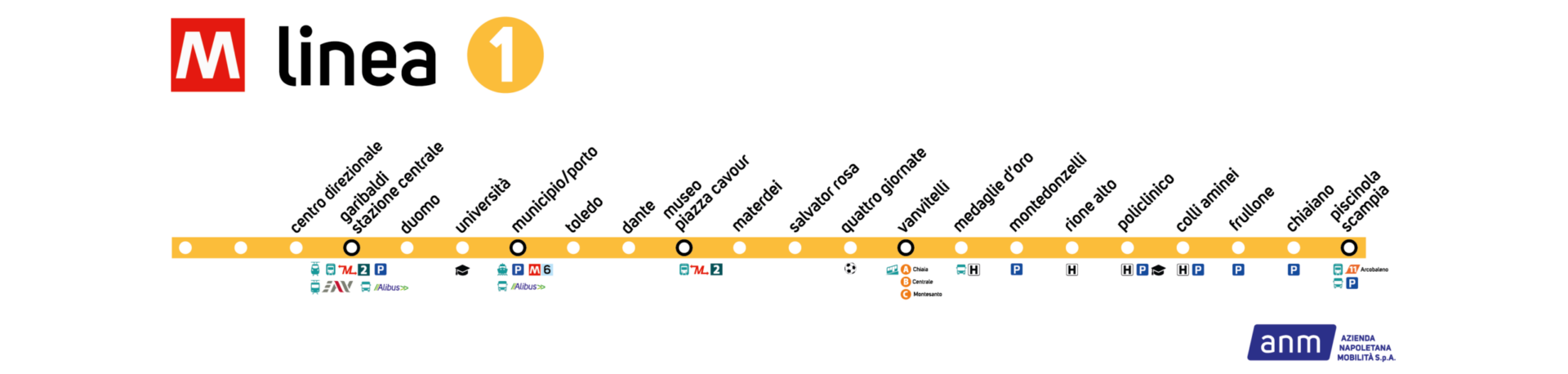 La Linea 1 metropolitana collega il capolinea nord di Piscinola/Scampia con il Centro Direzionale di Napoli, passando per la zona collinare del Vomero e il centro antico della città. Giunge al porto con un sottopasso collegato alla stazione Municipio/ Porto e si interconnette con le Ferrovie nazionali e l’Alta velocità, alla stazione Garibaldi.